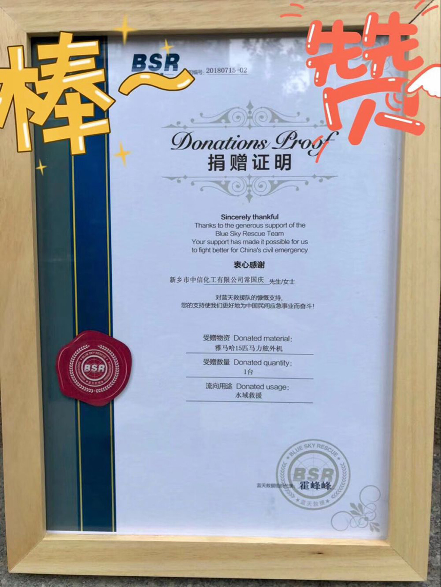 感恩生命,感恩生命中有您。中信化工一直心系社會,堅持社會公益,此次中信領導層來到新鄉藍天救援隊,向救援隊捐贈雅馬哈15匹馬力舷外機,幫助救援隊更好的水上救援。